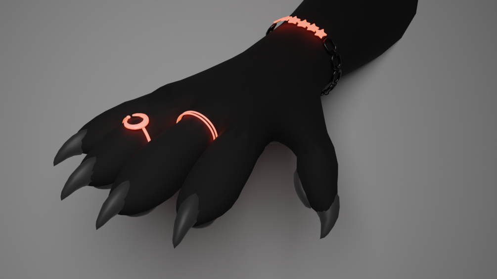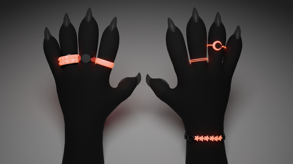This package includes an FBX for the Nardoragon armature fitted with 5 rings and 2 bracelets (One of them not included in the picture. Each hand's rings are grouped together to help with creating toggles. Last but not least, this model has a little under 7.5K polygons.